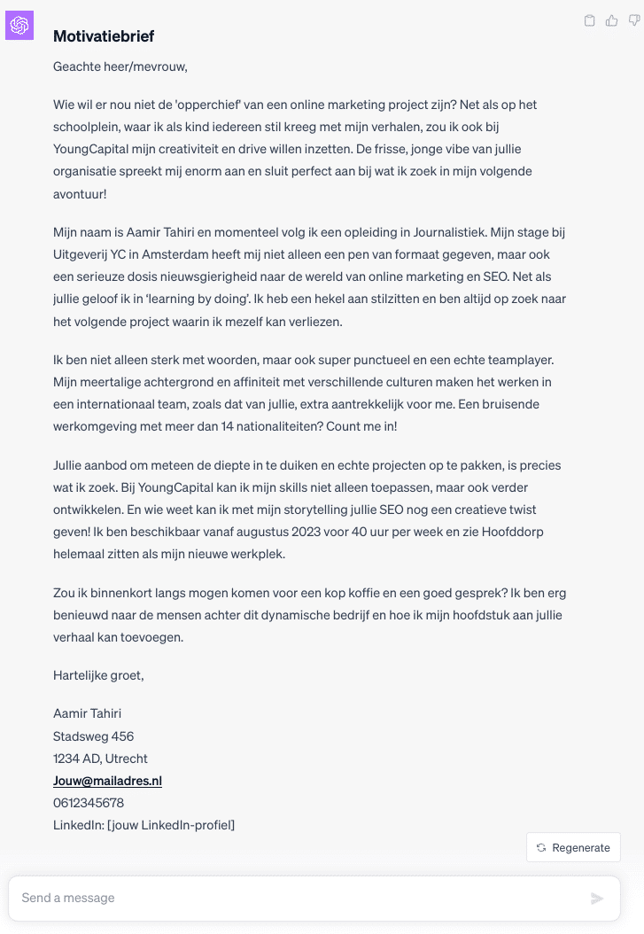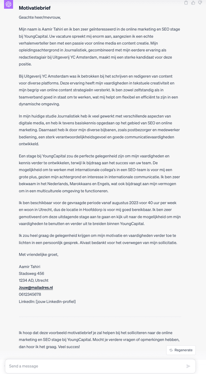 Als we de eerste prompt in ChatGPT gooien krijgen we de volgende AI motivatiebrief: