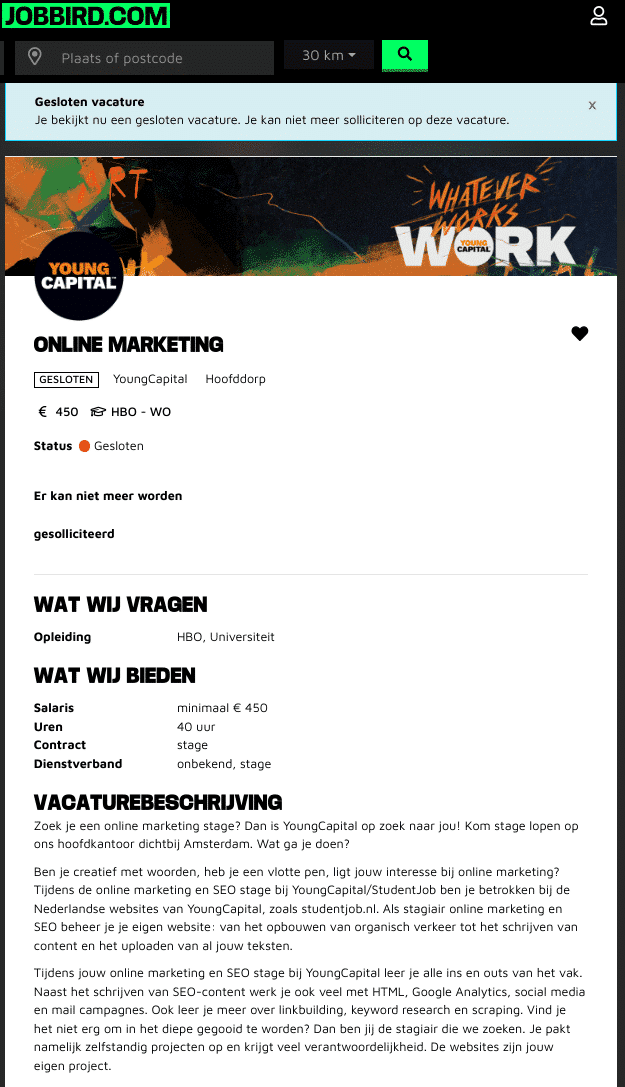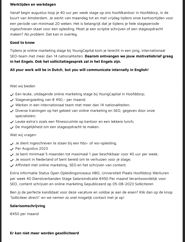Hier laten we je zien hoe een AI motivatiebrief schrijven nu in de praktijk gaat. Daarvoor gaan we uit van dit cv voorbeeld en de volgende vacature van YoungCapital op Jobbird:
